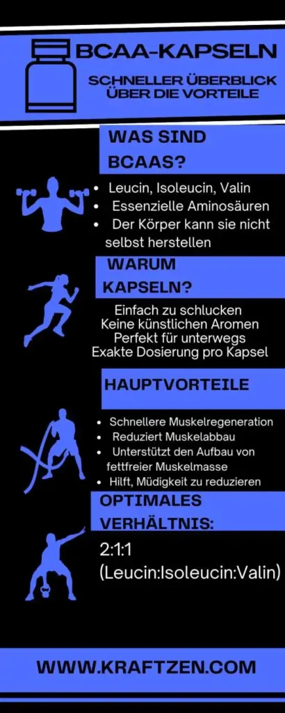 BCAA Kapseln sind einfach diese drei Aminosäuren in Kapselform gepresst. Meist im Verhältnis 2:1:1 (Leucin:Isoleucin:Valin), manchmal auch 4:1:1 oder andere Varianten.