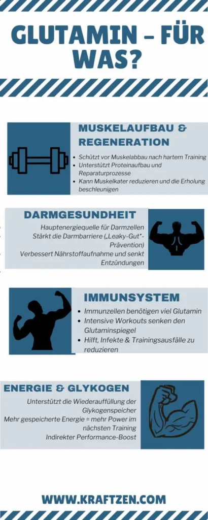 Hier wird es interessant für alle Kraftsportler da draußen. Glutamin spielt eine zentrale Rolle beim Proteinaufbau und verhindert gleichzeitig den Muskelabbau. Nach einem harten Training sind deine Glutamin-Speicher oft erschöpft. Dein Körper greift dann auf die Muskulatur zurück, um Glutamin zu gewinnen – genau das Gegenteil von dem, was du willst.