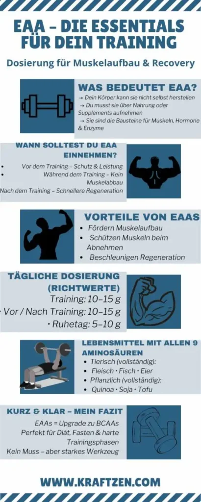 Wichtig: Das sind Richtwerte. Wenn du bereits viel Protein über die Nahrung aufnimmst (1,6-2,2 g pro kg Körpergewicht), brauchst du tendenziell weniger EAAs als Supplement. Sie ergänzen deine Ernährung, ersetzen sie nicht.